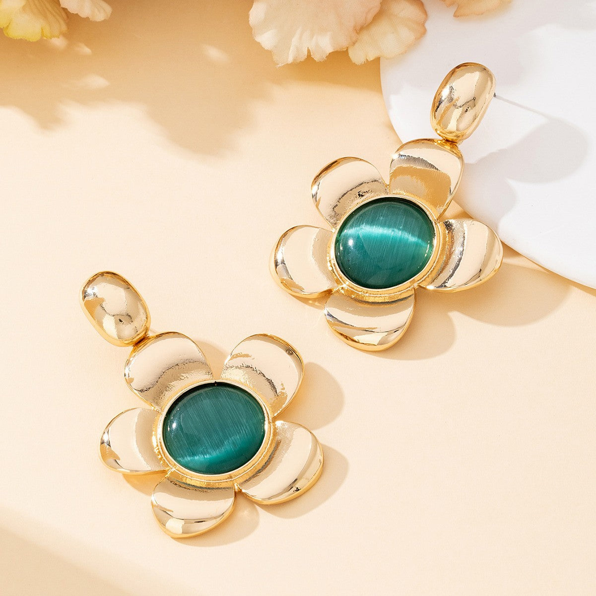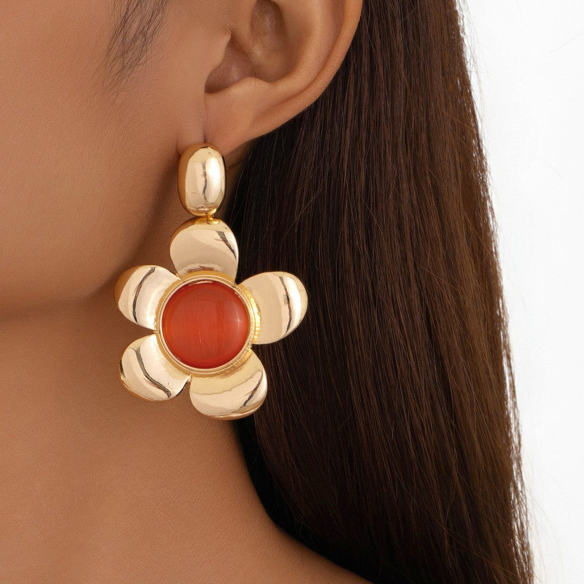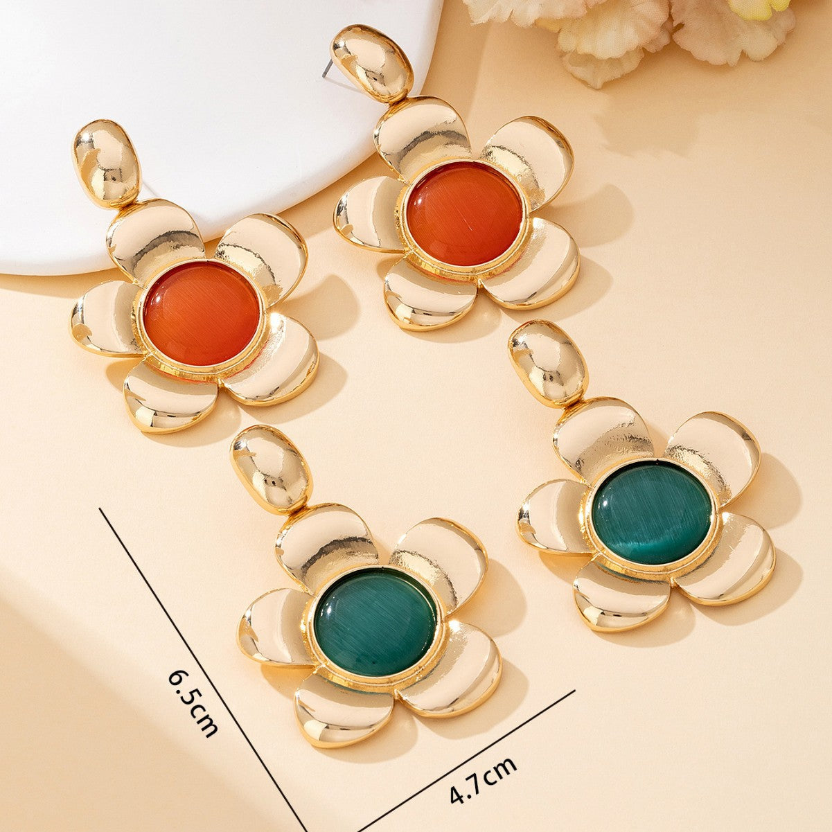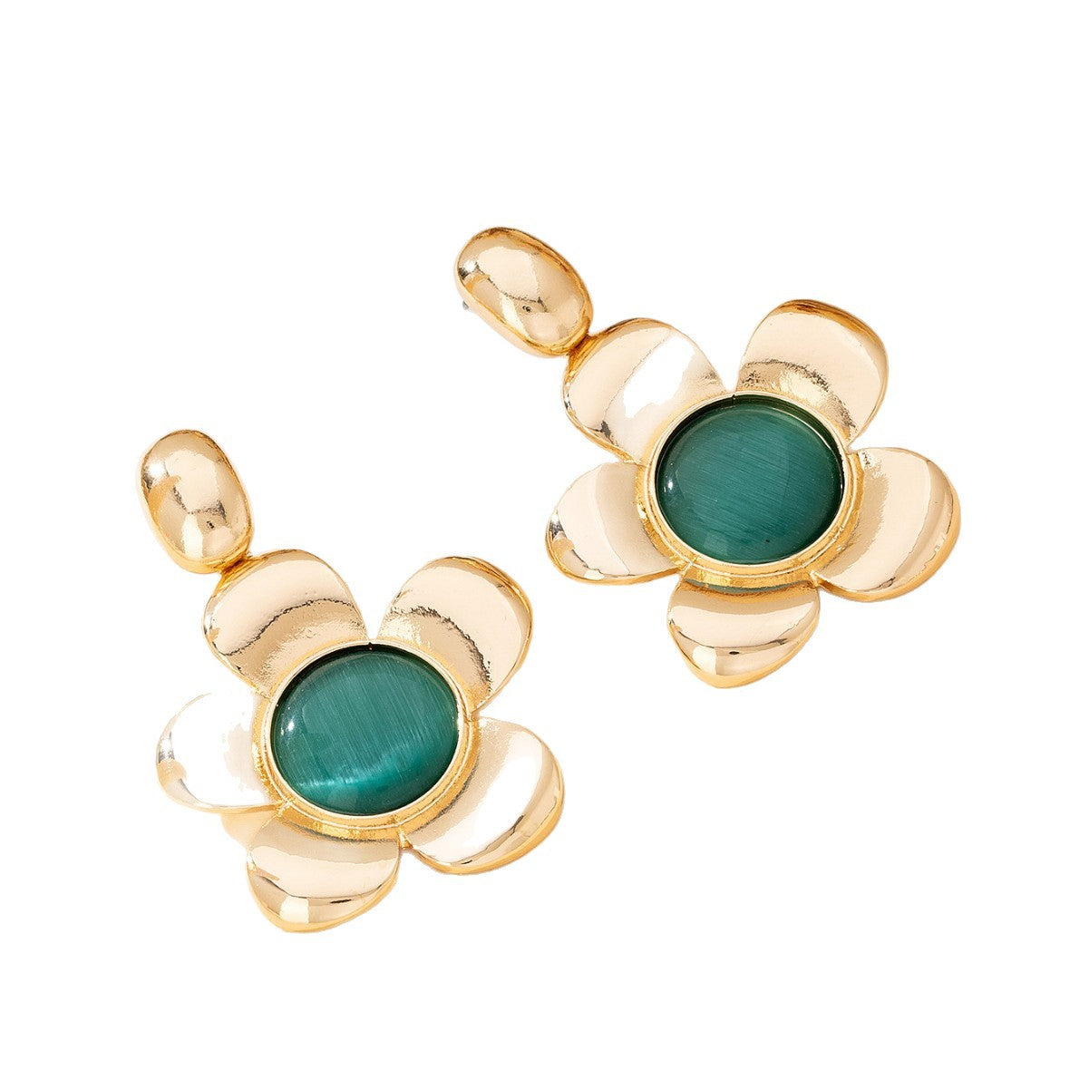 French Retro Flower Earrings for Women – Large Metal Cat’s Eye Jewelry -