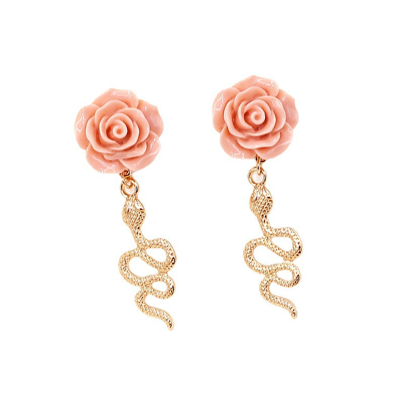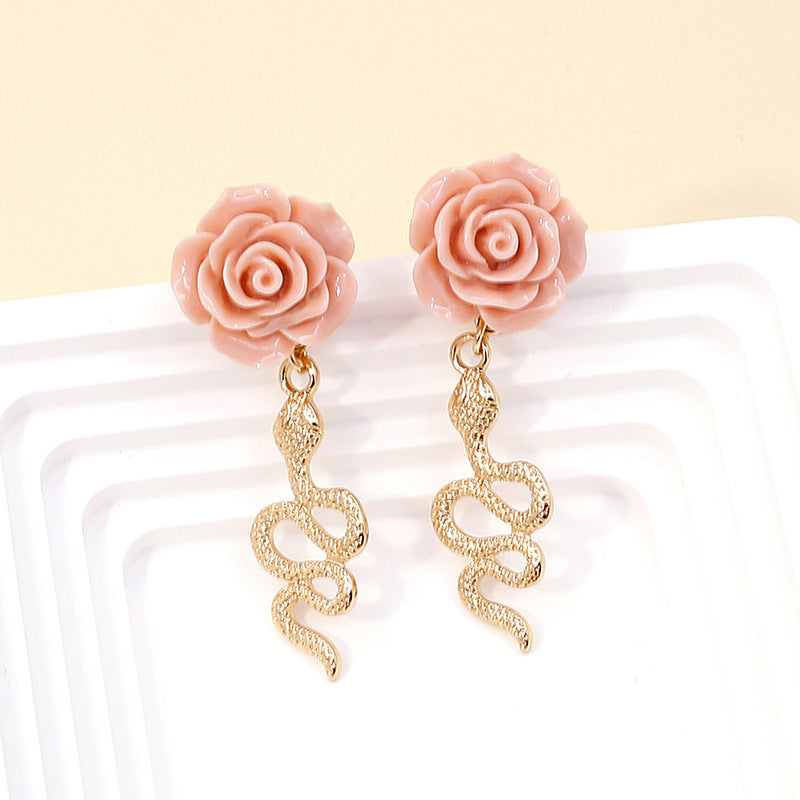 Women’s Geometric Rose Earrings – Retro Snake-Shaped Metal Long Drop Design -