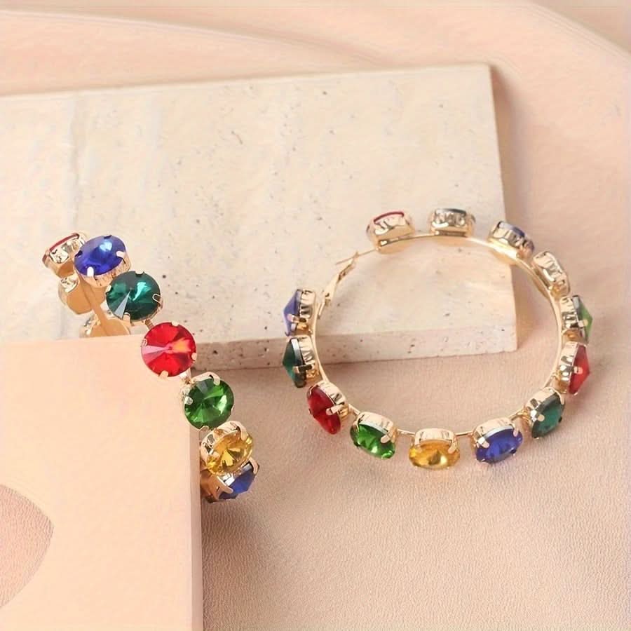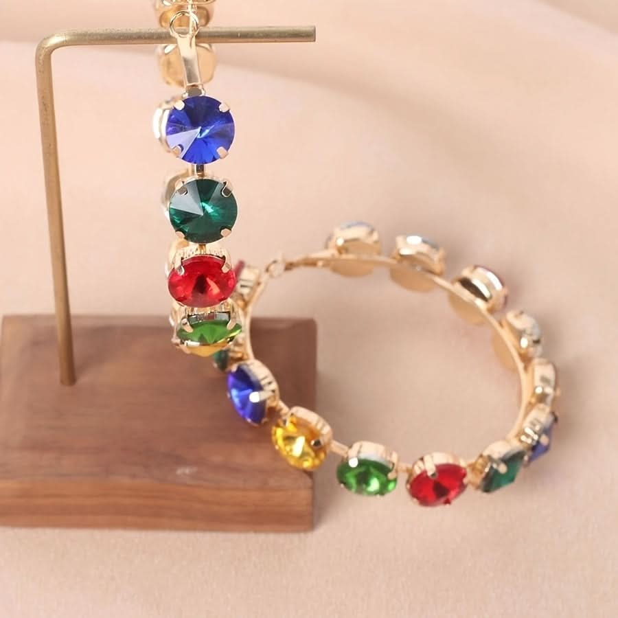 Large Bohemian Hoop Earrings with Colorful Rhinestones -