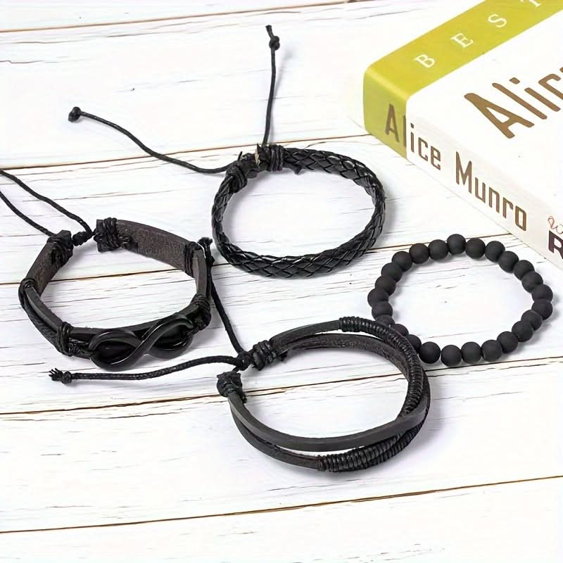 Men's Leather Bracelet Set – 4-Piece Multi-Layer -