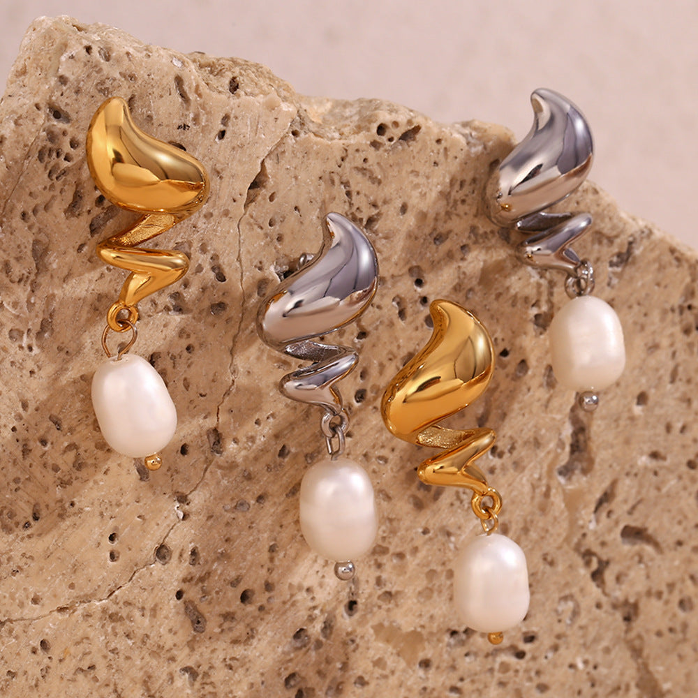 Spiral Flame Freshwater Pearl Earrings – Gold Plated Geometric Jewelry -