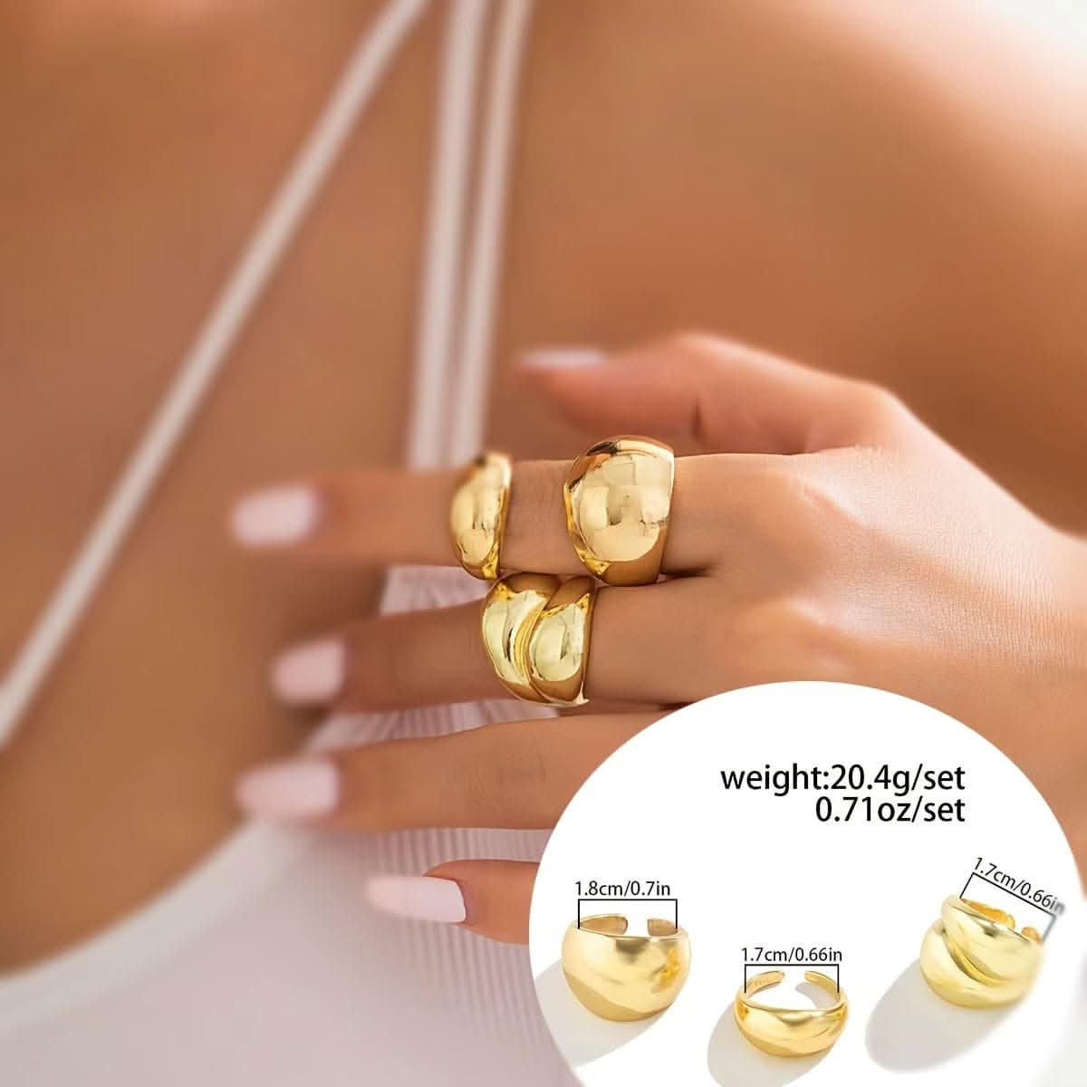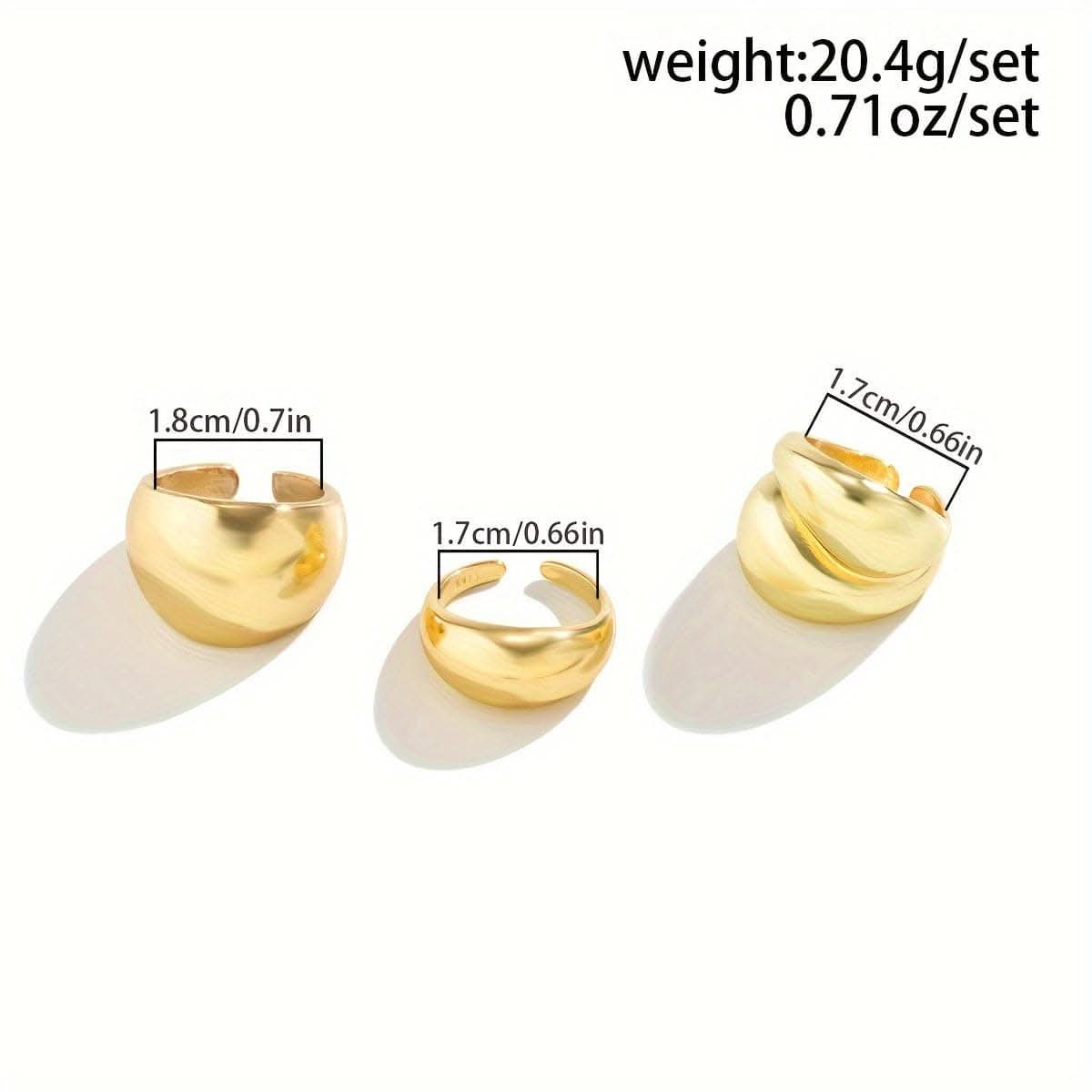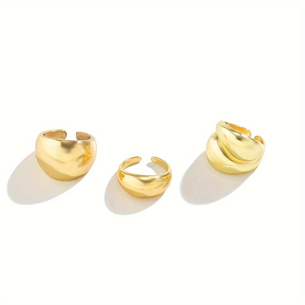 This set of 3 open rings features elegant geometric designs with exaggerated glossy spheres and dome bands. 14K gold plated and adjustable, these rings are perfect for adding a chic touch to any outfit.