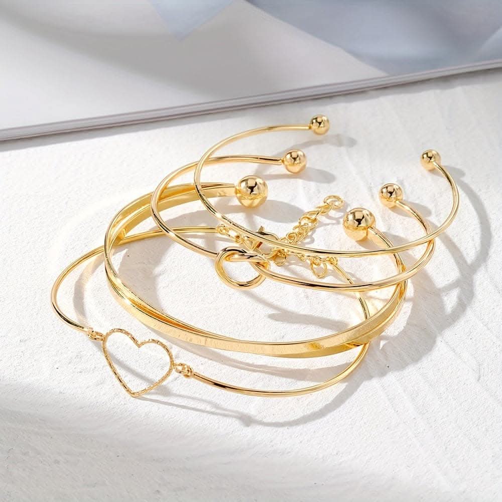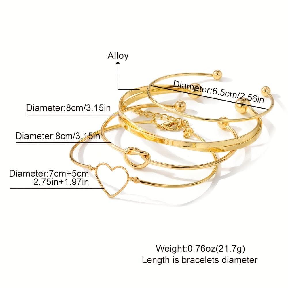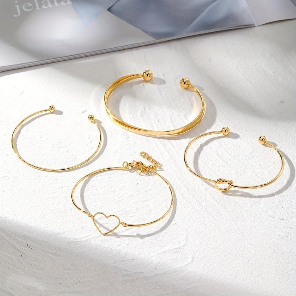 Product Description: A set of four golden knotted love cuff bangles crafted from alloy, designed for stackable elegance. Perfect as a stylish hand decoration, these bracelets offer a chic touch and make a thoughtful jewelry gift
