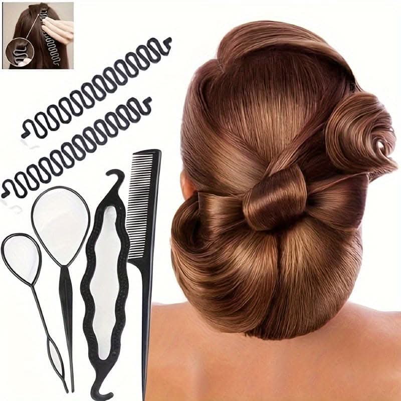 This 6-piece hair styling tool set includes a braided handle knitting tool, wide-tooth comb, hairpins, and other essential accessories. Ideal for easy styling and grooming, it provides everything you need for a polished and effortless look.