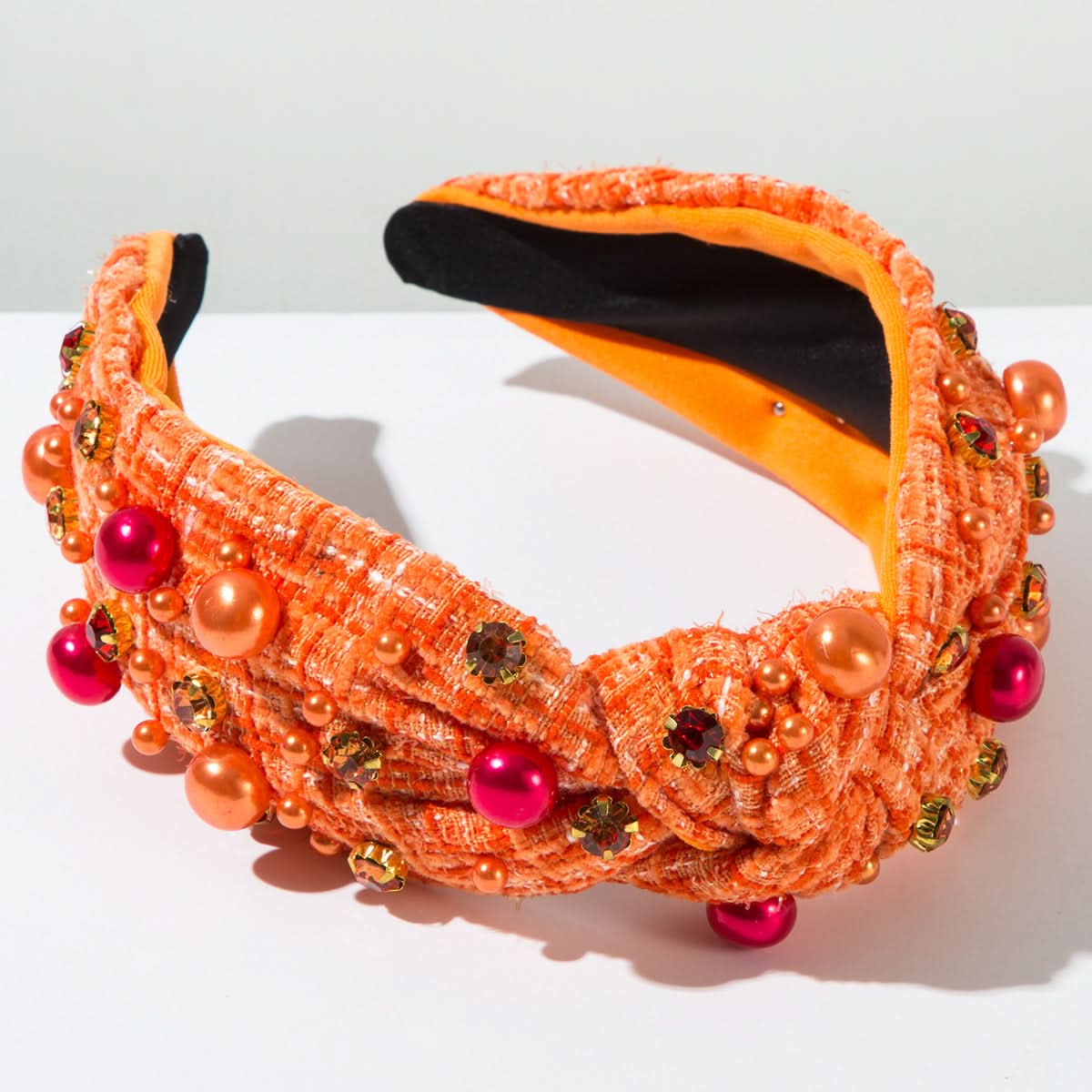 The Chanel-style knotted headband with diamond and pearl accents sounds like a chic and luxurious accessory. This type of headband combines classic elegance with a modern twist, making it a versatile addition to both casual and formal outfits.