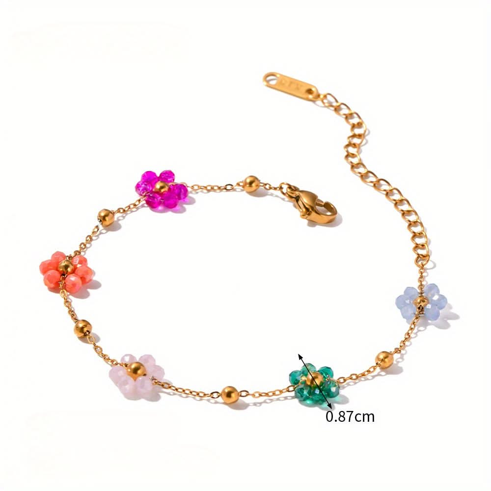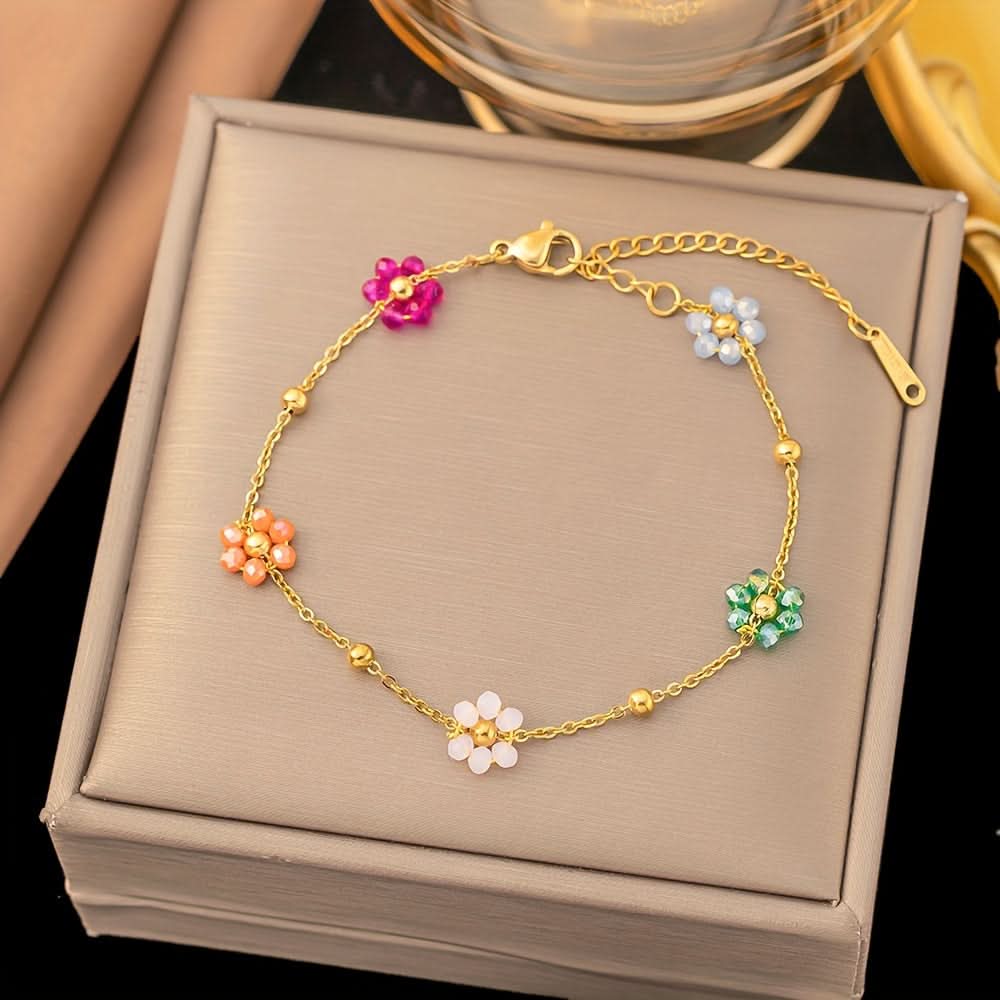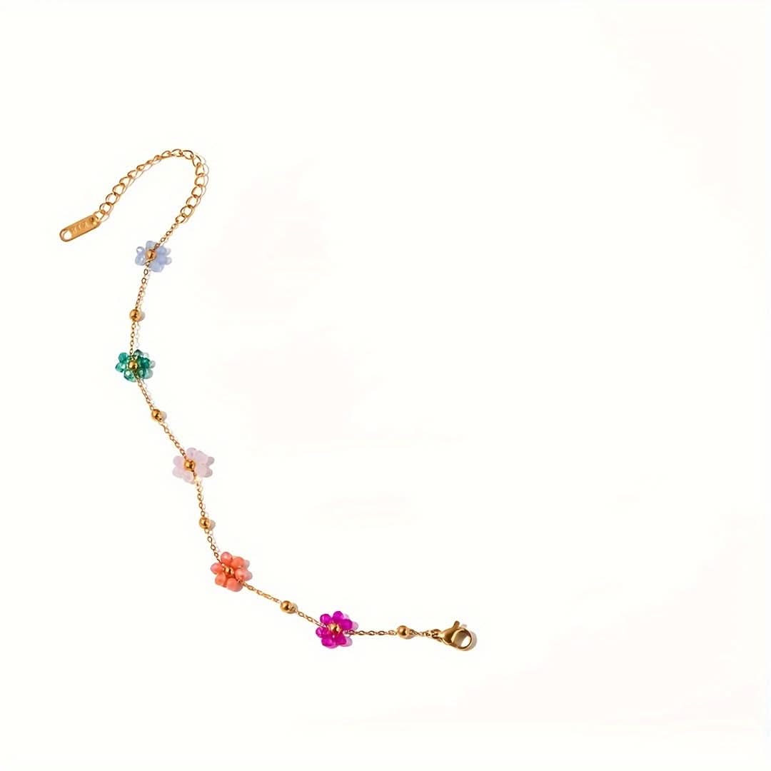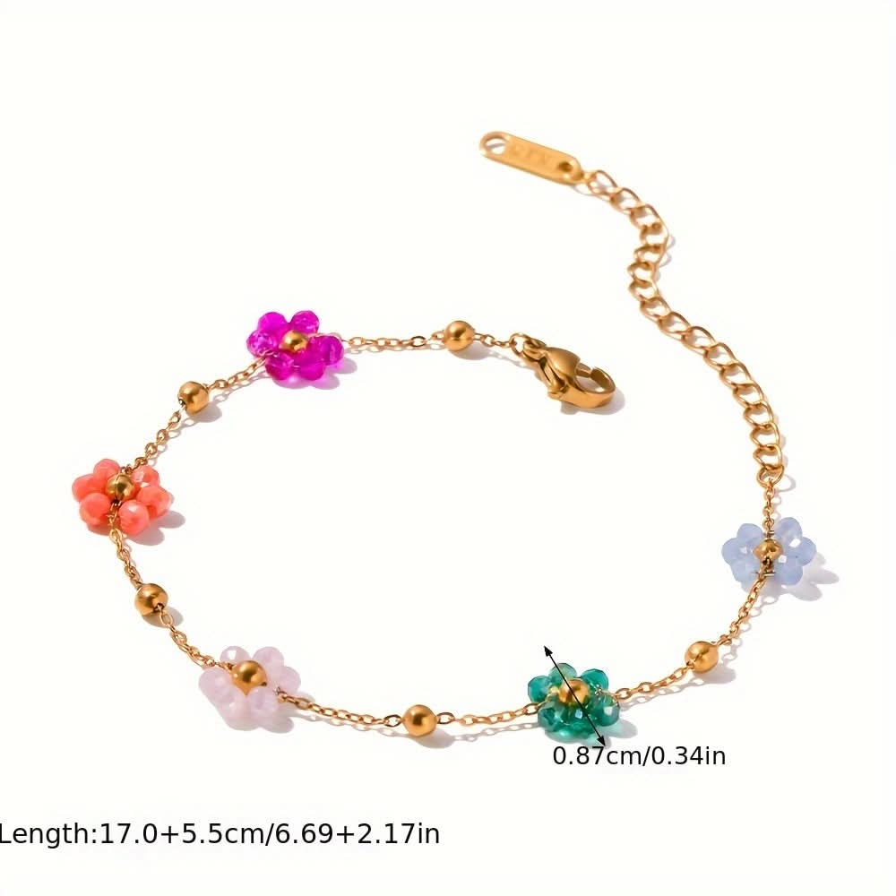 Add a touch of elegance and charm to your everyday look with this Boho Floral Chain Bracelet for Women. Handcrafted with intricate detail, this bracelet features colorful small flower accents set against a golden stainless steel chain, creating a harmonious blend of bohemian and ethnic styles.