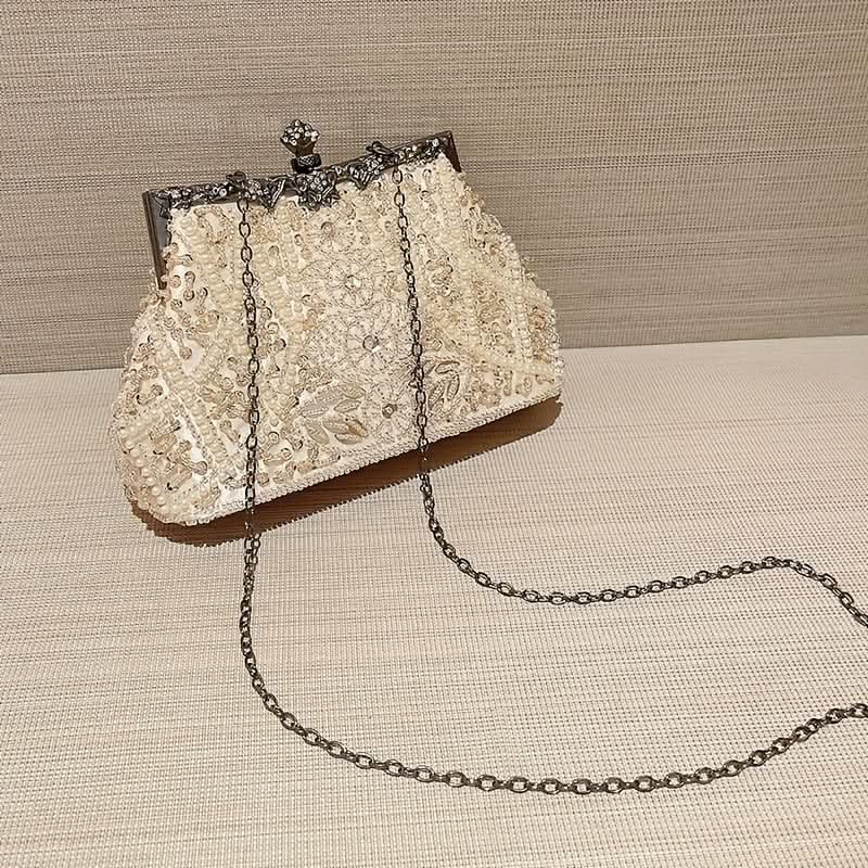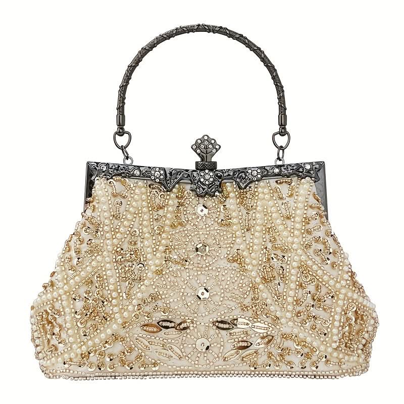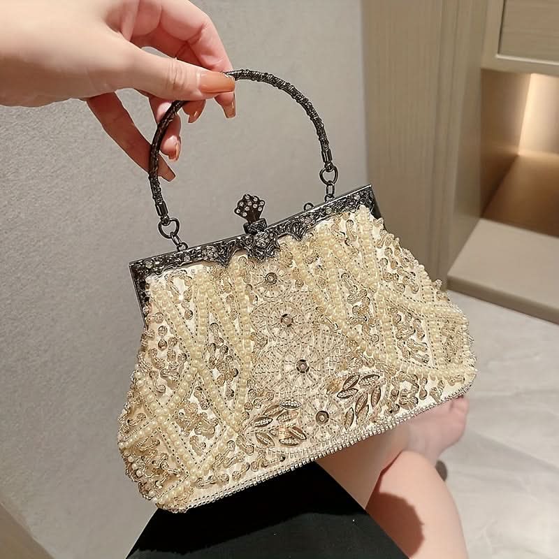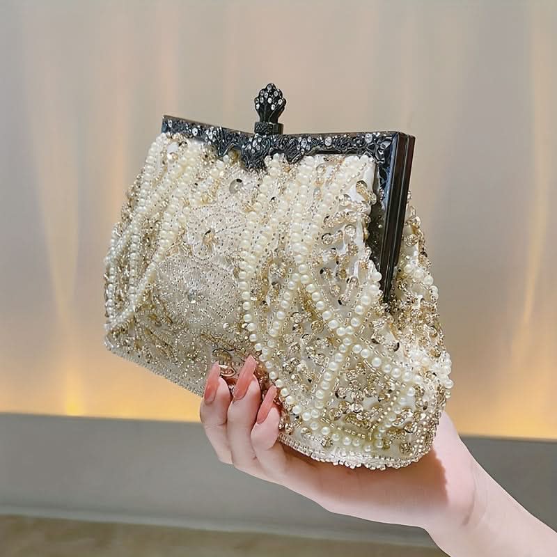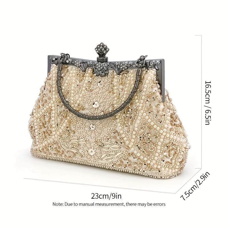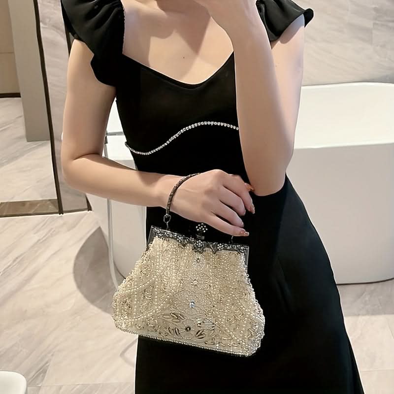 Elevate your special occasion look with this enchanting floral faux pearl and rhinestone kiss lock clutch. Designed for elegance, this glamorous party bag features sparkling rhinestones and a stunning faux pearl floral handle, adding a sophisticated touch to any outfit. The metal chain crossbody strap offers versatility, allowing you to wear it as a chic handbag or a hands-free messenger bag. Perfectly sized for your essentials, this clutch combines practicality with high-fashion appeal. The durable nylon exterior and soft polyester lining ensure a premium feel and lasting quality. Whether it's a wedding, gala, or formal event, this exquisite clutch is sure to make a statement and enhance your ensemble with its sparkling design and luxurious charm.