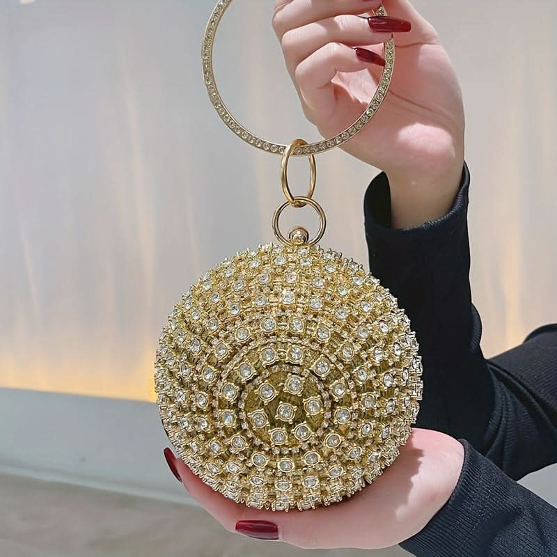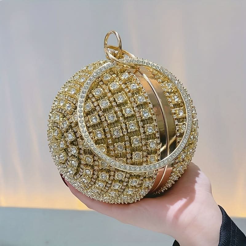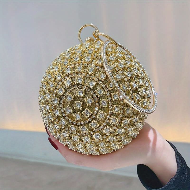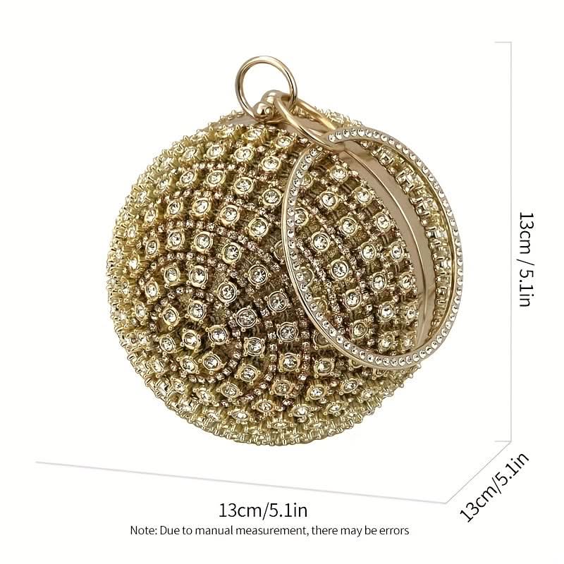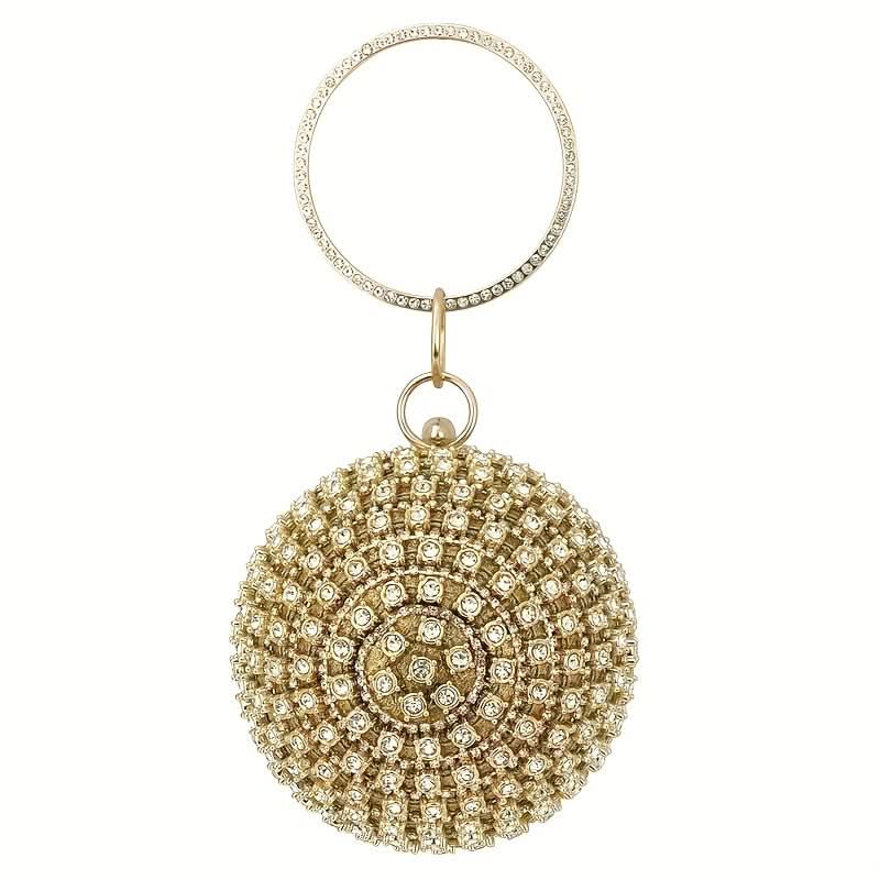 Turn heads at any event with this glamorous gold rhinestone evening clutch, a must-have accessory for weddings, proms, and unforgettable nights out. Its shimmering rhinestone design and sleek round shape bring a touch of elegance to any outfit, while the durable metal frame and secure buckle closure keep your essentials safe. The top ring detail offers both style and convenience, making it easy to carry or wear as a chic wristlet. Lined with soft polyester, this clutch is as practical as it is stunning, providing just enough space for your must-have items. Perfect for adding sparkle and sophistication, this clutch complements both classic and trendy evening looks, ensuring you shine wherever you go.