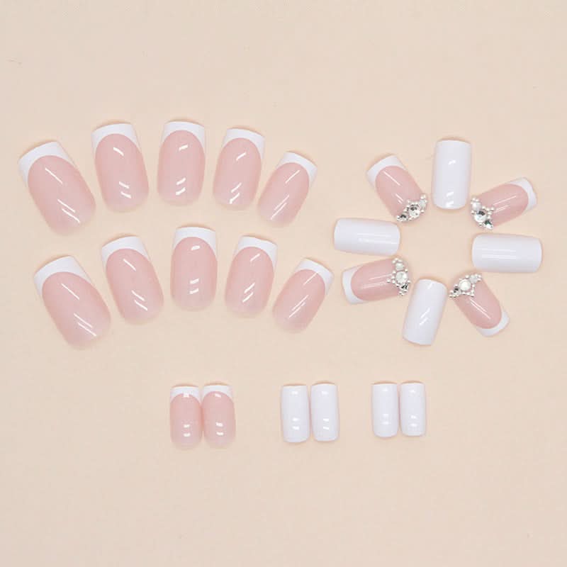 Achieve a chic look with these medium-length European square false nails in milky white. Featuring a glamorous French manicure with flash diamond accents, these sweet European and American style nails are perfect for adding a touch of elegance to any outfit.