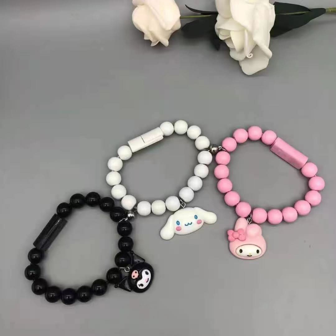 Stay stylish and connected with this adorable Sanrio Charging Bracelet, designed to combine fashion and function in one wearable accessory. Featuring popular characters like Cinnamoroll and My Melody, this bracelet doubles as a fast-charging data cable, making it perfect for anyone on the go. Simply detach the bracelet to reveal a convenient charging cable compatible with most devices. Crafted from durable plastic resin, it’s lightweight and comfortable, with a simplicity that pairs easily with any outfit. Handmade with attention to detail, this cartoon-inspired bracelet is both a cute fashion statement and a practical tech accessory. Ideal for those who love blending style with functionality, this charging bracelet is a must-have for fans of Sanrio and practical jewelry alike.