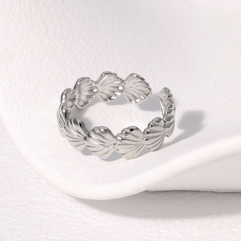Inspired by ocean elements and modern simplicity, this Shell Leaf Adjustable Ring is the perfect blend of elegance and versatility. Crafted from high-quality stainless steel, it’s resistant to fading and everyday wear—making it a timeless piece for daily styling or special occasions. The open band design ensures a comfortable, customizable fit, while the textured shell leaf pattern adds a touch of coastal charm. Whether you wear it solo or stack it with other favorites, this ring brings effortless style to any outfit. Handpicked from Abroad, it's a refined piece that speaks to those who appreciate subtle beauty with lasting quality. A standout in any jewelry box, this minimalist ring is your go-to for adding a soft statement to your look.