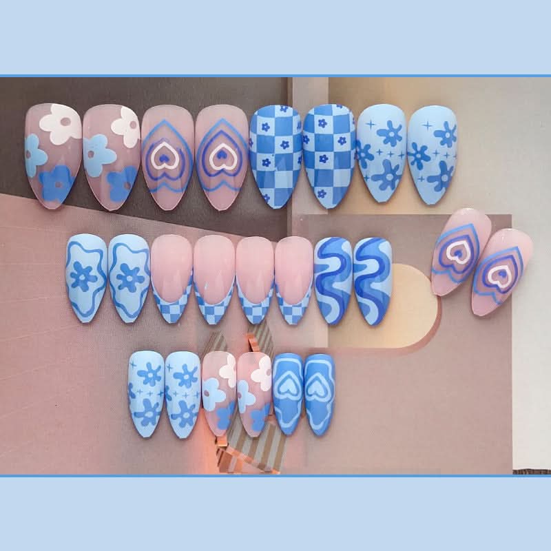 Elevate your nail game with these sky blue love-themed irregular nail pieces. Featuring a trendy almond shape, these false nails offer a unique and stylish touch, perfect for a fresh look in foreign trade nail patches.