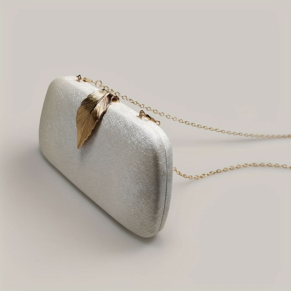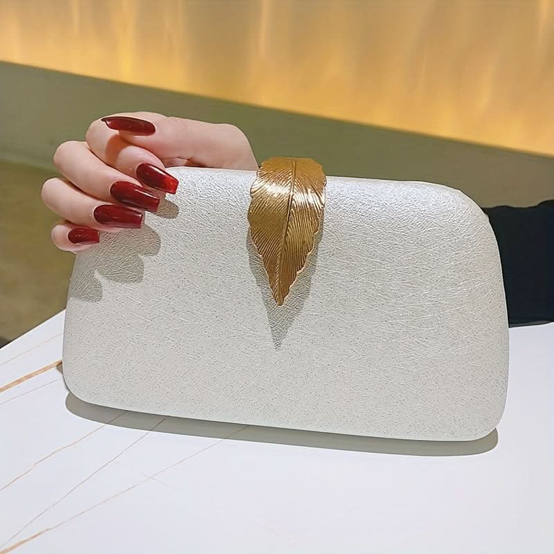 Elevate your evening look with this elegant white clutch, adorned with a beautiful leaf decor accent for a touch of sophistication. Made from high-quality faux leather, this solid-color clutch is both stylish and cruelty-free, ideal for weddings, proms, or any formal occasion. The secure buckle closure ensures your belongings stay safe, while the soft rayon lining adds a luxurious feel inside. Compact yet roomy enough for essentials like your phone, makeup, and keys, this clutch balances style and practicality. Its refined leaf detailing and timeless white color make it a versatile accessory that complements any outfit, adding a hint of natural elegance to your evening ensemble.